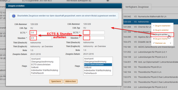 • das Splitting wird nur dann dauerhaft gespeichert, wenn die Zeugnisse Modulen zugewiesen sind.