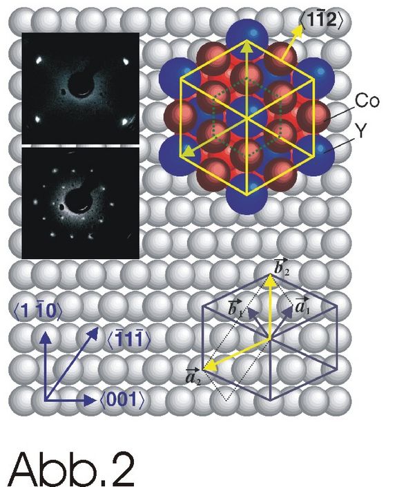 Abbildung 1 zeigt die Kristallstruktur von YCo2. Teilt man den Kristall entlang der gelb schraffierten Ebene, erhält man eine Oberflächenschicht von magnetischen Cobalt Atomen. Diese theoretische Voraussage wurde von einer Forschergruppe an der TU Dresden aufgeriffen (Yu. Dedkov und C. Laubschat), die YCo2 auf einer Wolframunterlage aufwachsen ließen. Dies geschah unter streng kontrollierten Bedingungen, sodass die gewünschte Cobalt Oberfläche entstand (Abb. 2). Mit Hilfe von Spin aufgelöster Photo-Elektronen Spektroskopie wurde dann mit zwei verschiedenen photonenenergien zuerst das magnetische Signal aus dem inneren des Kristalls (hohe Photonenenergie) und dann das magnetische Signal der Oberfläche (niedrige Photonenenergie)gemessen.