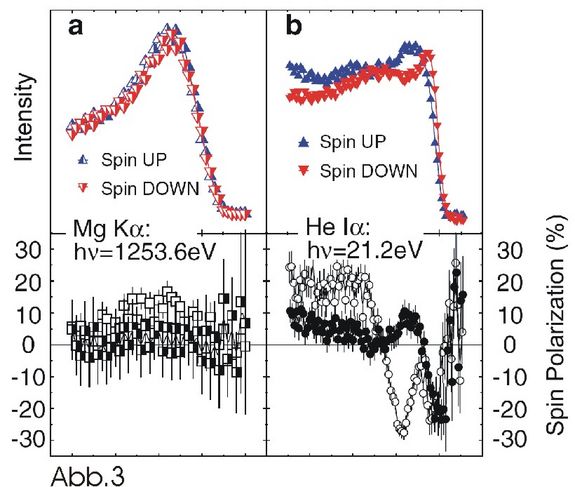 Es zeigte sich tatsächlich, dass YCo2 im Inneren kein magnetisches Signal liefert (Abb. 3a), die Ausbeute der Photoelektronen mit unterschiedlichem Spin (rote und blaue Kurve) ist gleich groß. An Oberfläche werden die beiden Signale jedoch deutlich unterschiedlich (Abb. 3b), was die experimentelle Bestätigung der ursprünglichen theoretischen Voraussage liefert. YCo2 stellt somit das erste natürlich vorkommende Material dar, welches Oberflächenmagnetismus zeigt. (Yu. Dedkov, C. Laubschat, S. Khmelevskyi, J. Redinger, P. Mohn, M. Weinert, Physical Review Letters 99, 047204 (2007)). Materialien mit natürlichem Oberflächenmagnetismus könnten ihre Anwendungen bei Spin-Transistoren finden, da bei diesen natürlichen Materialien verschiedene unerwünschte Effekte wegfallen, die bei künstlichen magnetischen Oberflächen (z.B. eine Eisenschicht auf Kupfer) leider vorhanden sind. Dieses Ergebnis sollte nun das Tor zur Suche weiterer derartiger Materialen eröffnen.