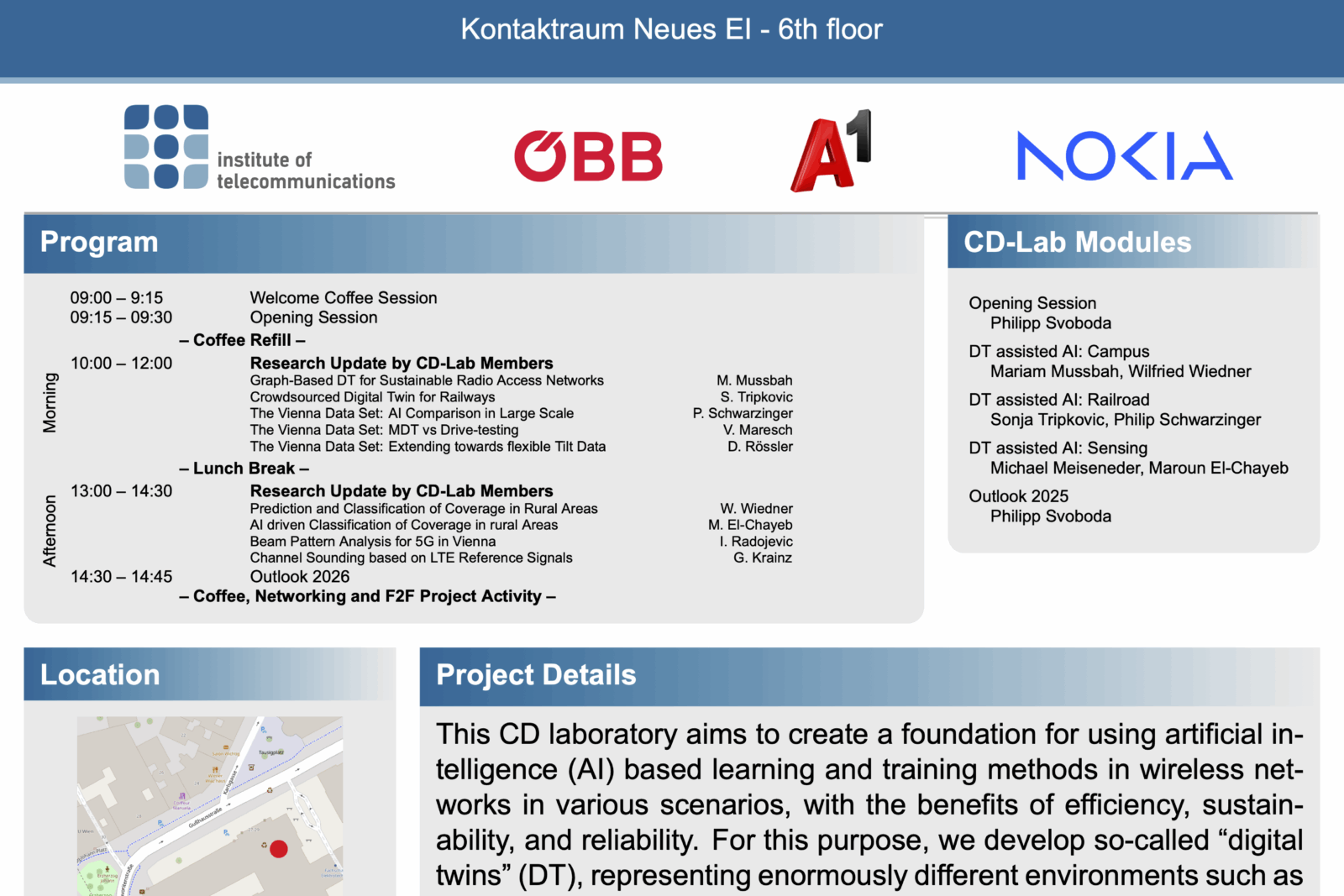 Join us on November 15, 2024, at 9 AM at Kontaktraum, Gusshausstrasse 27, A-1040, for the Second Annual Open Day and Workshop of the Christian Doppler Laboratory: Digital Twin Assisted AI for Sustainable RAN. Don’t miss this opportunity to explore the latest advancements in sustainable radio access networks!