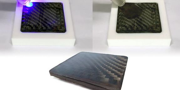 „Der entscheidende Vorteil dieser Methode ist, dass man nicht wie bei anderen lichthärtenden Materialien das gesamte Harz beleuchten muss“, erklärt Liska. „Es genügt, irgendeinen beliebigen Punkt mit Licht zu treffen. Der Rest härtet dann ganz von alleine, ohne weiteren Energieeintrag, aus.“ Bisher hat man im Bereich der Faserverbundwerkstoffe meist Zweikomponenten-Formulierungen verwendet. Sie werden zunächst direkt vor Ort mühsam zusammengemischt und müssen dann sehr schnell verarbeitet werden, bevor sie zum Teil unter hohem Zeit- und Energieaufwand ausgehärtet werden können.