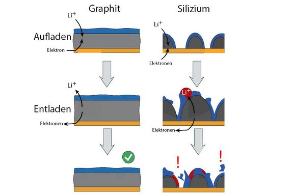 In einem Lithiumionen Akku sind die Materialien in ständigem Kontakt mit dem flüssigen Elektrolyten, in dem beim Lade- und beim Entladevorgang komplexe chemische Abbaureaktionen ablaufen. Und so bildet sich an der Oberfläche der Elektroden immer ein dünner Film aus ionenleitfähigen Abbauprodukten. Auf Graphit ist diese Schicht – ähnlich einer Passivschicht auf Edelstahl - nach wenigen Ladezyklen stabil und wächst nicht mehr weiter. Doch wenn man Silizium-Körnchen verwendet, die ihr Volumen drastisch vergrößern, reißt diese dünne Grenzschicht immer wieder auf, an den Rissen bildet sich eine neue Schicht. Damit wird bei jedem Ladezyklus ein bisschen Elektrolyt aufgebraucht, und das führt zu einer kurzen Lebensdauer des Akkus.