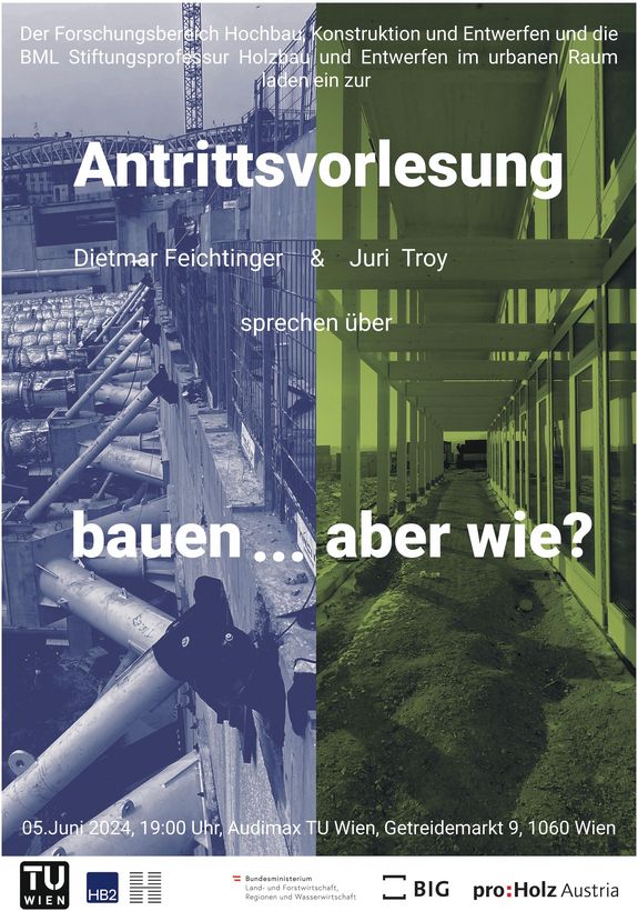 Der Forschungsbereich Hochbau, Konstruktion und Entwerfen und die BML Stiftungsprofessur Holzbau und Entwerfen im urbanen Raum laden herzlich zu Vortrag und Gespräch über Aufgaben und Möglichkeiten von Architektur und Lehre am Mi., 05.06.2024 um 19.00 Uhr im Audimax TU Wien, Getreidemarkt 9, 1060 Wien mit anschließendem Umtrunk im Hof des Audimax.