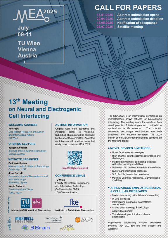 The MEA 2025 is an international conference on microelectrode arrays (MEAs) for bioelectronic interfacing. The meeting spans the spectrum from developments of technologies and methods to applications in life sciences. The scientific committee encourages contributions from both academia and industrial research.